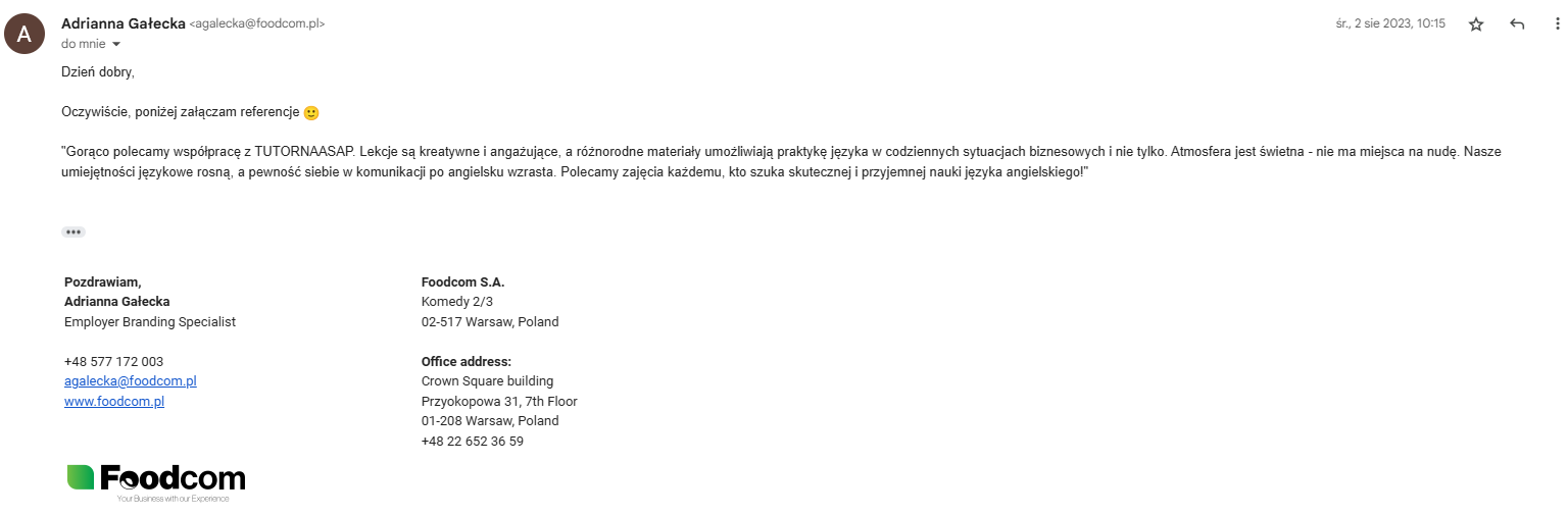 "Pragnę polecić szkołę językową TUTORnaASAP Sp. z o.o. reprezentowaną przez pana Marcina Sucheckiego jako firmę szkoleniową świadczącą wysokiej jakości usługi. Jesteśmy bardzo zadowoleni z poziomu oraz organizacji szkoleń które od samego początku współpracy były indywidualnie dostosowywane do naszych potrzeb. (…)"